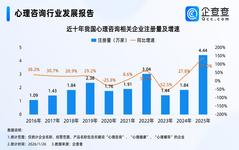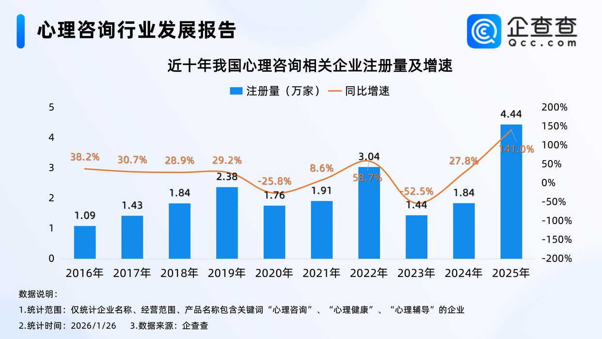 企查查数据显示,近十年,我国心理咨询相关企业每年注册量基本在1.4万家至2.4万家之间,仅2022年和2025年注册量超过3万家,其中2025年全年,相关企业注册量同比激增141.0%至4.44万家,创近十年注册量及其增速双高峰。