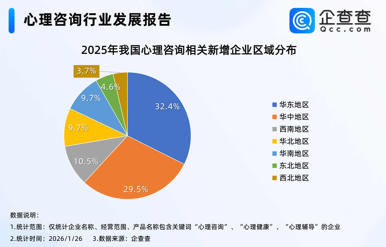 企查查数据显示,2025年全年,我国心理咨询相关企业注册量同比激增141%至4.44万家,创近十年注册量及其增速双高峰;区域分布上,2025年华东地区相关企业注册量最高,占比32.4%,其次是华中地区,占比29.5%;企业存量方面,截至2026年1月26日,我国现存心理咨询相关企业数量已正式突破16万家。
