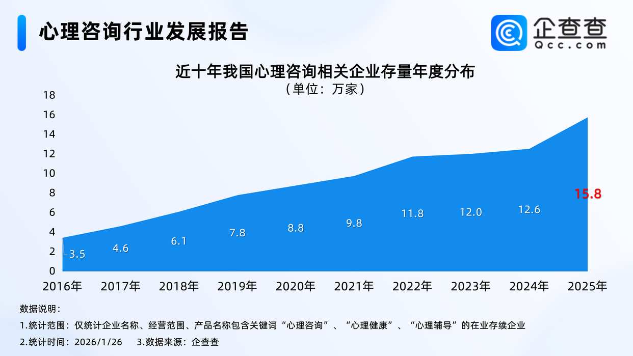 企查查数据显示,近十年,我国心理咨询相关企业存量基本逐年增加,2025年增速加快,2025年年底,我国心理咨询相关企业存量达15.8万家。截至2026年1月26日,我国现存心理咨询相关企业数量已超16万家。