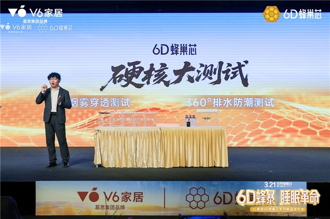 3月14日,深圳科技馆内,V6家居举办“6D蜂暴睡眠革命”系列新品发布会。围绕“用科技实现舒适生活”的品牌主张,现场通过极限飞车挑战、集装箱压顶、烟雾穿透、排水防潮四大测试,将6D蜂巢芯的支撑性、透气性、排湿性等技术指标转化为可感知的视觉呈现。在3.21世界睡眠日来临之际,这场硬核发布会让6D蜂巢芯的科技性能真正实现了可量化、可感知、可触及,也让V6家居“用科技实现舒适生活”的品牌主张,从一句口号变成了看得见的事实。